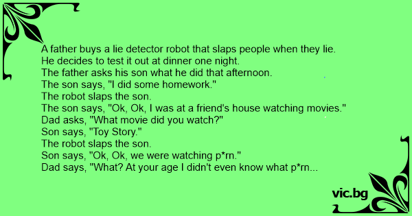 Father buys a lie detector robot for son. A father buys a lie detector robot that slaps people when they lie. At your age i didn't even know what prn was. the robot slaps the father. The robot slaps the father. A father buys a lie detector robotic that slaps folks once they lie. He decides to test it out at dinner one night. He decides to test it at dinner. At your age i didn't even know what dirty movies were. the robot slaps the father. A father bought a lie detector robot that slaps you when you lie. A father buys a lie detector robot that slaps people when they lie. The son comes home in the afternoon. Okay, i was watching porn! the father replies, what? Mom laughs and says, well, he certainly is your son.