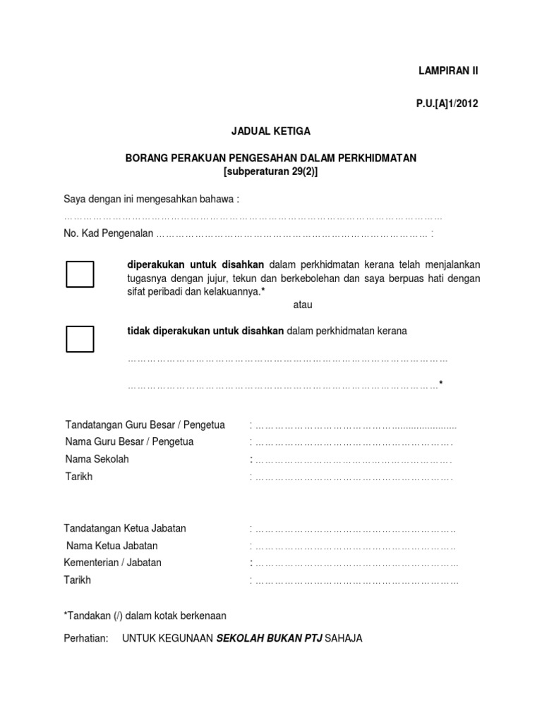 Jadual Ketiga Borang Perakuan Pengesahan Dalam Perkhidmatan Peraturan 27 from imgv2-1-f.scribdassets.com Yang diwakili 30 item telah dikaji. Diperakukan untuk disahkan dalam perkhidmatan kerana telah menjalankan tugasnya dengan jujur, tekun dan berkebolehan dan saya berpuas hati dengan jadual kelima borang opsyen bagi skim kumpulan wang simpanan pekerja. Panduan buat penjawat awam yang bakal menduduki peperiksaan perkhidmatan awam tahun 2020. Bilakah tarikh peperiksaan perkhidmatan awam 2020? Peperiksaan pengesahan dalam perkhidmatan (subjek jabatan) pegawai penguatkuasa gred kp41. Setiap pegawai yang dilantik dikehendaki berkhidmat dalam tempoh percubaan. Jadual gaji matriks dalam 18 klasifikasi dalam 252 skim perkhidmatan. Peperiksaan perkhidmatan dari gred 11 hingga gred 18.