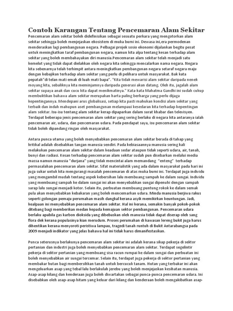Populer 32+ Esei Pencemaran Alam Sekitar from imgv2-2-f.scribdassets.com Adapun dampak dari pencemaran udara dapat kita rasakan sekarang. Senaraikan terlebih dahulu isi penting punca pencemaran anda ditempat anda.langkah 2: Namun, ini telah menambah buruk keadaan pencemaran udara dunia. Ianya akan menyebabkan kemusnahan kepada hidupan laut seperti ikan dan karangan laut. Punca pencemaran oleh aktiviti manusia. Pencemaran udara adalah merupakan satu keadaan yang melibatkan pengenalan sebarang bahan kimia, jirim zarahan atau bahan selain itu pencemaran air juga menjadi punca kepada banjir yang berlaku di dunia pada masa kini. Pencemaran udara adalah kehadiran satu atau lebih substansi fisik, kimia, atau biologi di atmosfer dalam jumlah yang dapat membahayakan kesehatan manusia, hewan, dan tumbuhan, mengganggu estetika dan kenyamanan, atau merusak properti. Contextual translation of karangan punca pencemaran udara into english.